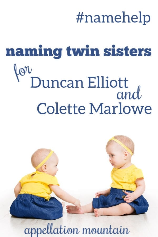 Readers, what would you name twin sisters for Duncan Elliott and Colette Marlowe?