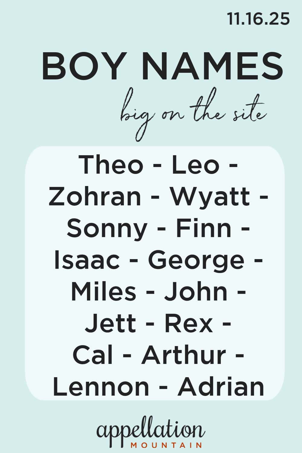 Will there be an uptick in baby Boscos? My guess is no, but I was delighted to note a character named Bosco LeRoy in Now You See Me, Now You Don’t, the latest installment in the magician/Robin Hood saga. Dominic Sessa plays the part. Just 29 boys were named Bosco in 2024, so the saintly surname is a long shot, but it’s also a Bo- name ending with O, so … maybe?